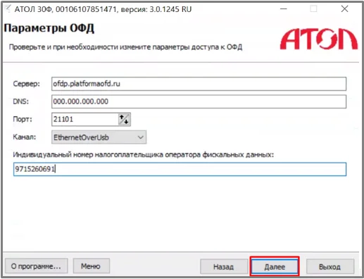 - Следующий этап — заполнение параметров ОФД, как на следующем изображении. Поле «Сервер» для работы с Контур.ОФД нужно ввести ip-адрес 185.170.204.91 или ссылку ofdp.platformaofd.ru: