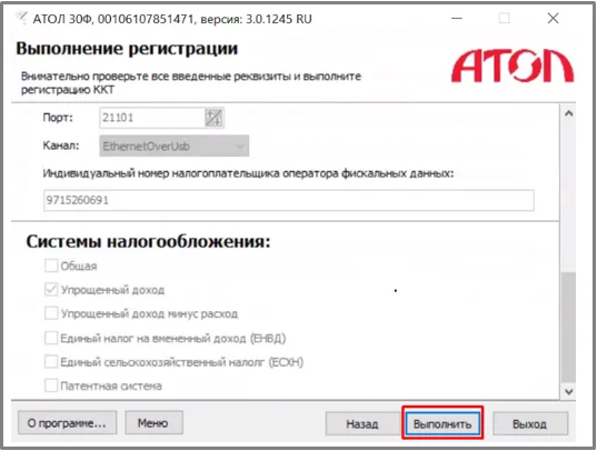 - Система направит пользователя в раздел «Выполнение регистрации». Прежде чем нажать кнопку «Выполнить», следует еще раз все проверить: